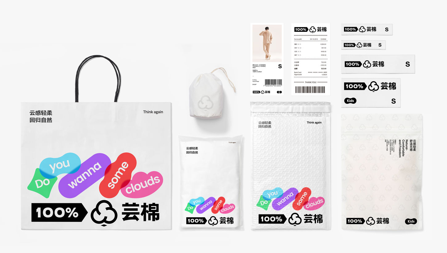 芸棉是一个全棉织品品牌,融合线上线下,推出了集亲子、女装、男装、个人护理等为一体的全业态综合体。基于品牌“全棉”与“芸感”的定位,通过设计语言重塑品牌形象,在强调“全棉”的产品属性时,清晰传达自然、舒适的品牌语言。标志设计体现了“全棉”与“芸感”的不同解读,我们以棉花花的造型呼应“白云”的轻盈感,“100%”的标签样式与标志的组合,向受众传达“全棉”定位,也表达芸棉对品质高追求的品牌使命。